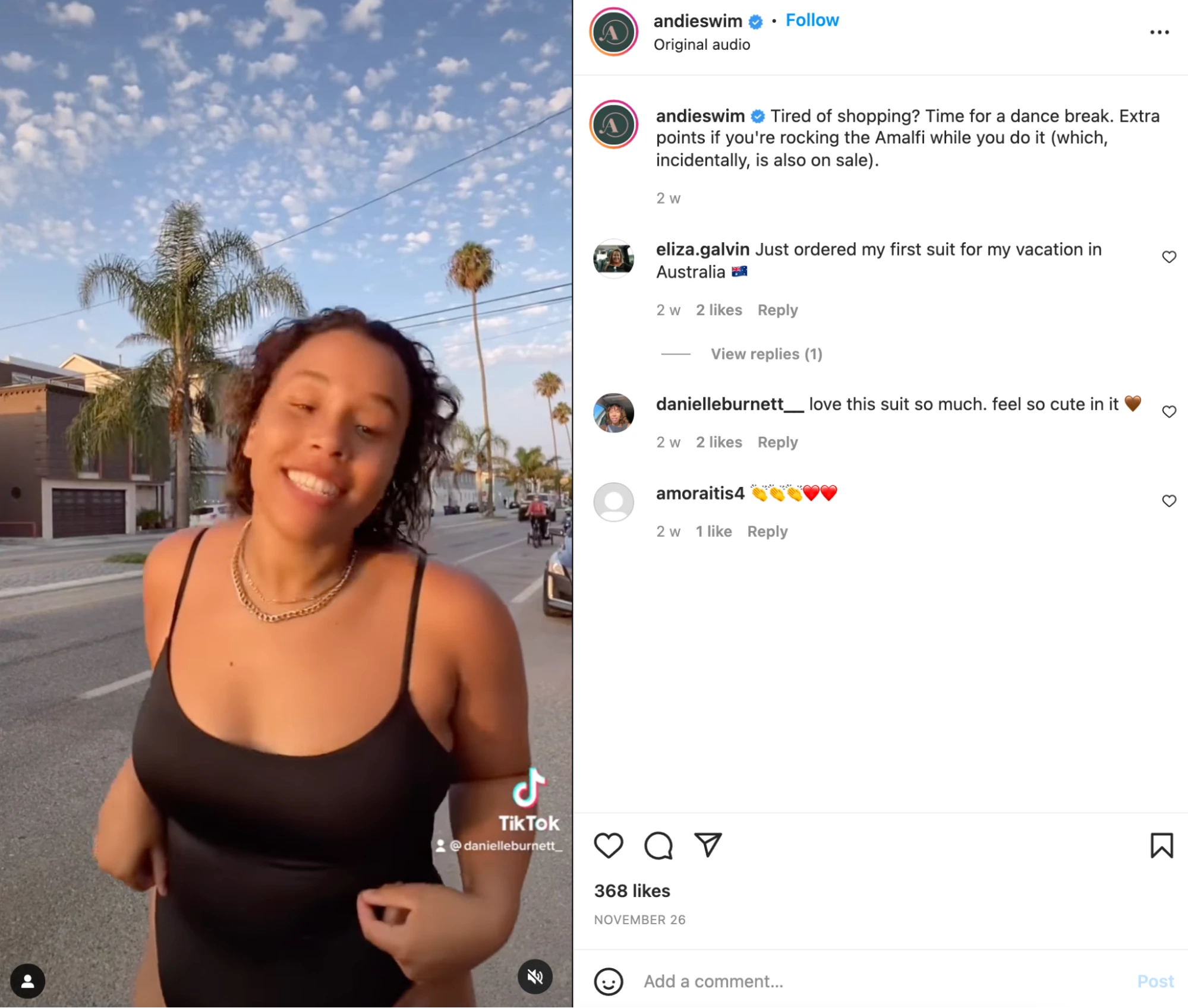 O objetivo é construir uma biblioteca de UGC de alta qualidade que convença os seguidores de mídia social a comprar, como este exemplo de Andie Swim. Seu cliente anterior criou um vídeo do TikTok, que Andie Swim repostado no Instagram.
