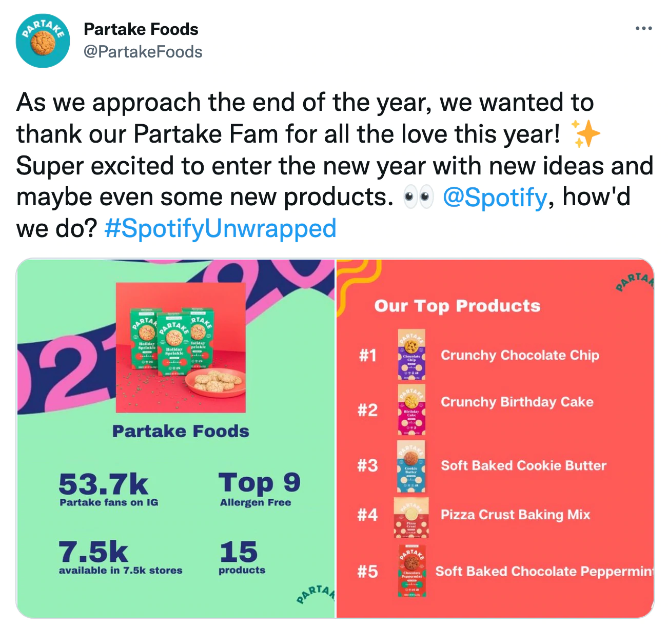 A Participar Foods, por exemplo, postou este tweet que replicava o Spotify Unwrapped – o resumo anual de músicas que um usuário ouvia ao longo do ano da plataforma de música. Somente neste caso, a Parttake Foods trocou as músicas mais ouvidas em favor dos principais produtos: