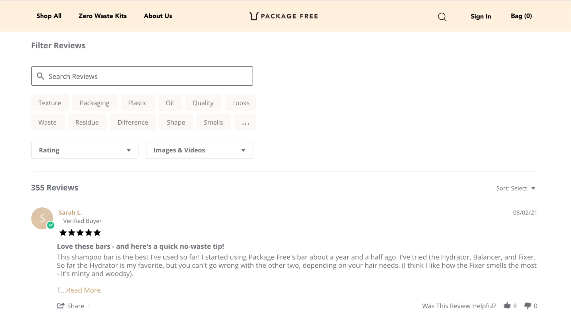O Package Free, por exemplo, tem um destaque de comentários de clientes em suas páginas de produtos. Qualquer um que esteja debatendo se deve confiar no varejista fica instantaneamente tranquilizado, sem dúvida melhorando a taxa de conversão do site de comércio eletrônico: