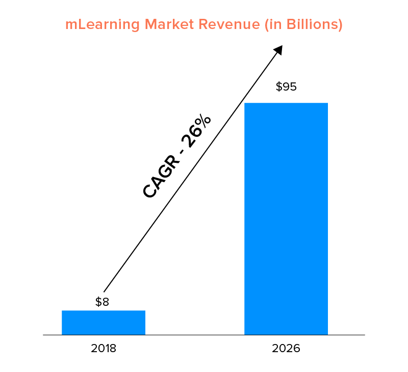 Os aplicativos móveis para o setor educacional estão mudando o ambiente de aprendizagem. Uma evidência clara disso é que o tamanho do mercado de aprendizagem móvel deverá crescer de US $ 8 bilhões para US $ 95 bilhões entre 2018 e 2026, com um CAGR de 26%.