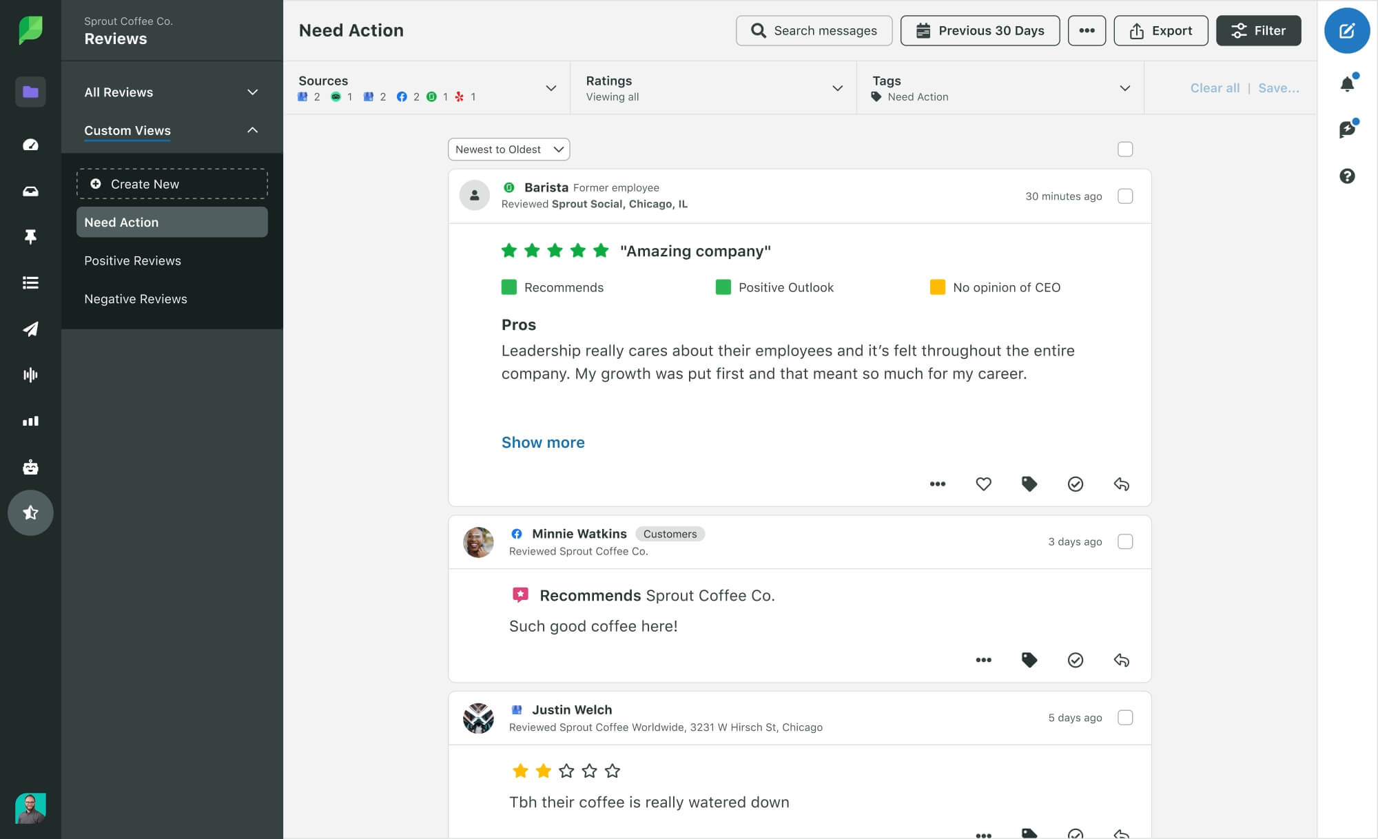 A maneira mais fácil de proteger a reputação da sua marca online é usar uma ferramenta que organize todas essas notificações em uma plataforma centralizada. Por exemplo, o Sprout Social consolida caixas de entrada em redes de mídia social e sites de avaliação populares como Google Meu Negócio, Yelp, TripAdvisor e Glassdoor, para que você nunca perca uma menção.