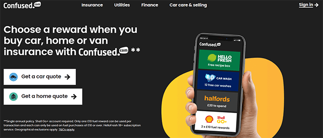 E como um benefício adicional, você ainda ganhará recompensas ao comprar seguro de carro, casa ou van por meio do Confused.com. As recompensas disponíveis incluem itens como combustível, lavagens de carros gratuitas, vouchers para Halfords e uma caixa de receitas Hello Fresh.