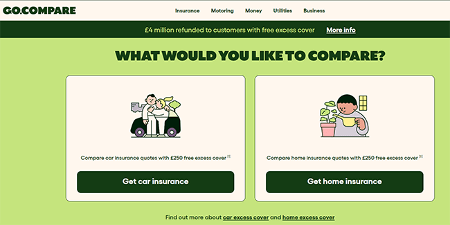 Assim como o MoneySuperMarket, o GoCompare também é um site baseado no Reino Unido que pode ser usado para comparar uma ampla gama de produtos de seguros. Você pode usar este site para encontrar cotações para tudo, desde seguro de carro a seguro de viagem e muito mais.