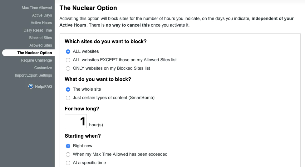 O StayFocusd também tem uma opção nuclear que permite bloquear o acesso a todos os sites — ou a todos, exceto os sites que você precisa usar (por exemplo, Google Docs) — quando você precisa se concentrar em uma tarefa específica. É uma ótima ferramenta para quando você precisa minimizar as distrações, mas está lutando com a força de vontade necessária para fazer isso por conta própria.