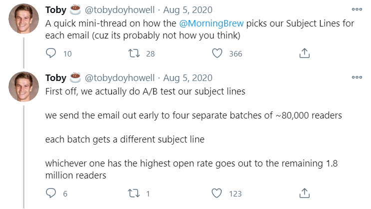 A marca testou cada linha de assunto de e-mail de cinco maneiras diferentes antes de enviar e-mails para toda a lista. Para saber como isso funciona, confira este tópico no Twitter do escritor da Morning Brew, Toby Howell.