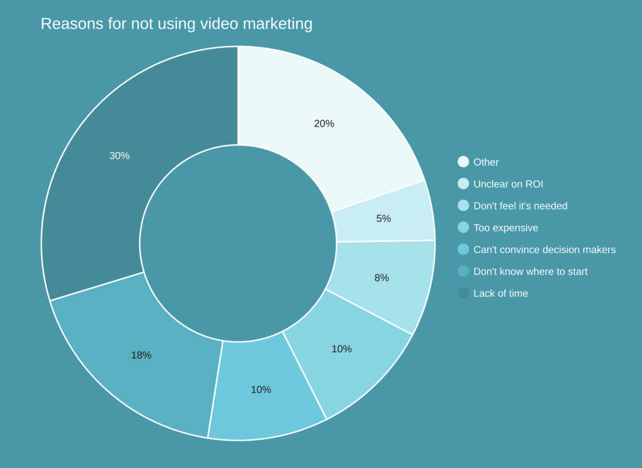 - Os três principais motivos pelos quais as empresas não usam conteúdo de vídeo são a falta de tempo (30%), a falta de conhecimento (18%) e a incapacidade de convencer os principais tomadores de decisão a investir em vídeo (10%). ( Relatório Wyzowl sobre o estado do marketing de vídeo de 2023 )