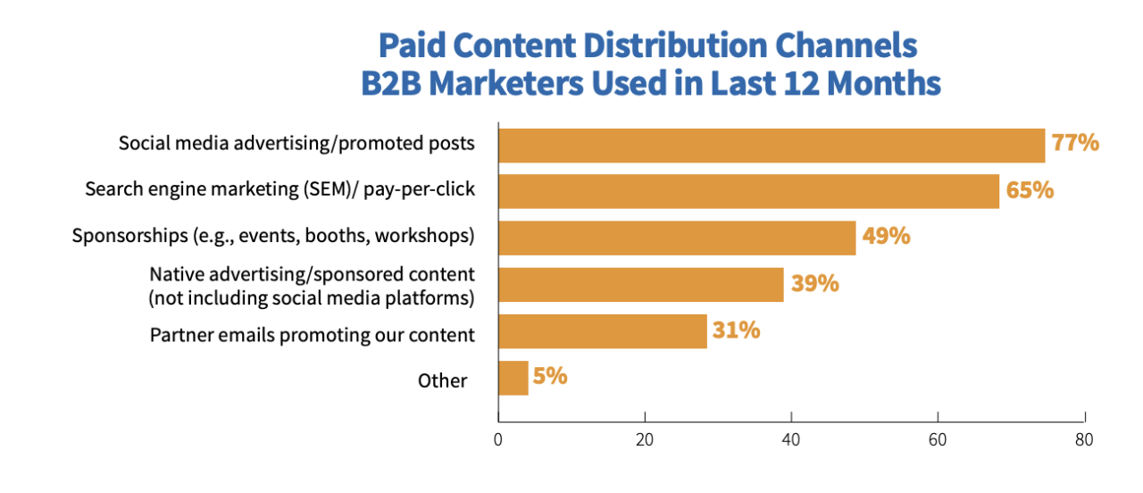 - A publicidade nas redes sociais é a forma de promoção de conteúdo pago mais utilizada na indústria B2B, utilizada por 77% dos principais profissionais de marketing. Isto é seguido por SEM (Search Engine Marketing) e PPC (Pay Per Click) com 65%. ( Instituto de Marketing de Conteúdo )