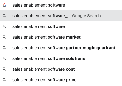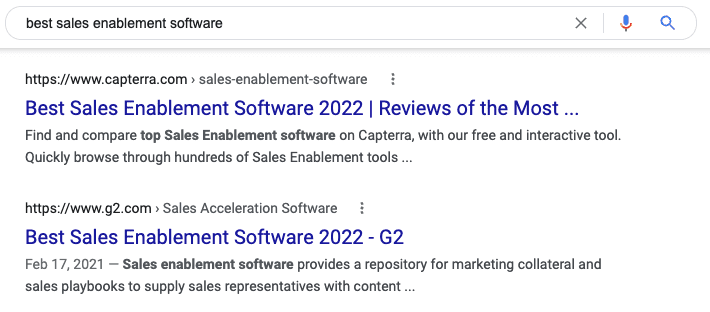 Desde que você estabeleceu seu TAM, coloque-se no lugar deles. Use a SERP como se você fosse um cliente em potencial procurando sua solução. Se eu estivesse procurando por uma ferramenta de capacitação de vendas, eu procuraria algo assim.