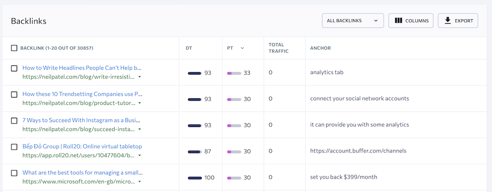 Da mesma forma, na coluna “Backlinks” do relatório de visão geral, você pode clicar no número de seus backlinks e acessar o relatório de backlinks para verificar todos os seus backlinks e textos âncora.