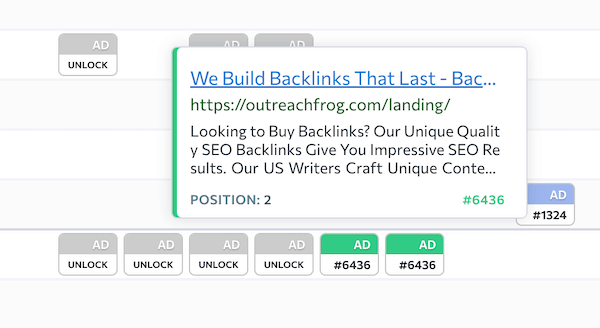 No relatório de visão geral, role para baixo até encontrar a seção “Anúncios mais populares para a palavra-chave analisada”. Aqui você encontrará dados de campanha PPC em sites que segmentam palavras-chave semelhantes em suas campanhas publicitárias.