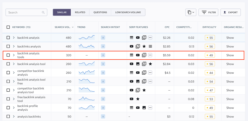 Se a sua palavra-chave inicial for muito ampla, essa lista é particularmente útil para segmentar e identificar palavras-chave com a combinação certa de volume e dificuldade de pesquisa.