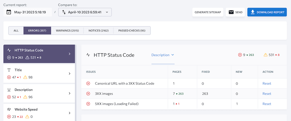A seção “Erros” do relatório consistirá nos problemas técnicos de SEO mais críticos em seu site, corrigindo os quais você pode obter uma pontuação de integridade de SEO mais alta.