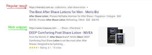 Você também pode estender links orgânicos como rich snippets. O resultado terá uma classificação, o número de comentários, preço, informações de disponibilidade, etc.