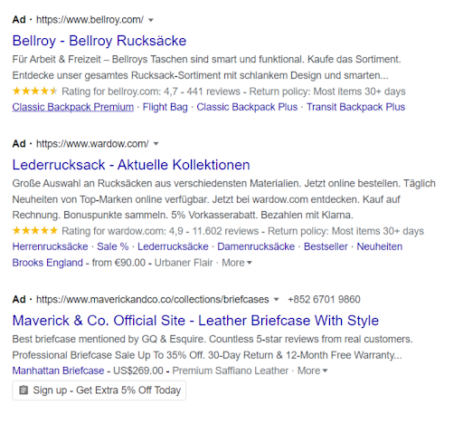 Eles também compilam o anúncio, que pode assumir várias formas. Eles podem ser baseados em texto ou mais visuais com classificação, preço, números de telefone e muito mais. Ele permite que os consumidores avaliem o anúncio sem clicar no link para saber se ele atende às suas necessidades.