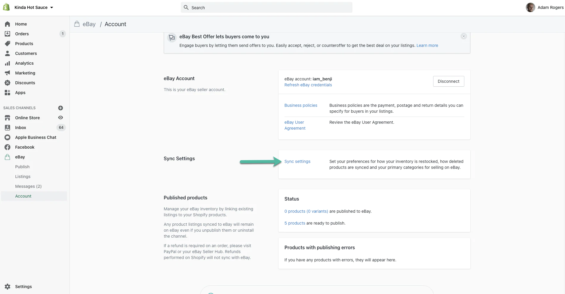 Em seguida, você sincronizará as configurações. No menu Canal de vendas do eBay , clique na opção Configurações de sincronização .