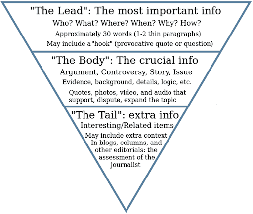 Usar a técnica de escrita e formatação da pirâmide invertida é bastante útil. Ele exige a adição dos detalhes mais importantes na parte superior do conteúdo: