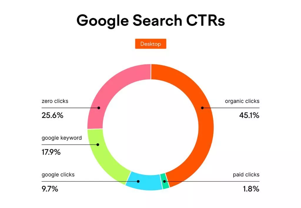 Entre o grupo de teste, mais de 25% das buscas terminaram sem cliques. Os usuários escolheram cliques orgânicos quase metade das vezes, e outros tipos de cliques ocuparam os outros 25%.