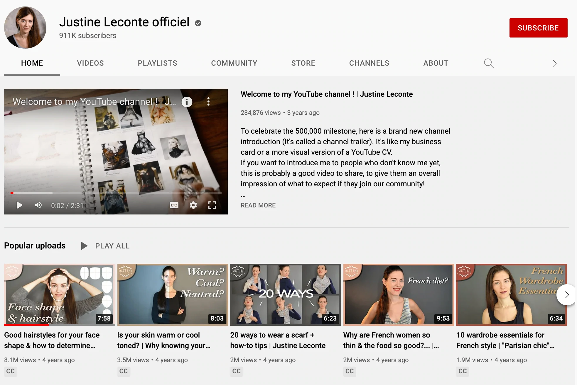 Tomemos como exemplo a designer Justine Leconte. Justine é uma designer de moda e joalheria que se concentra em garantir que suas roupas sejam produzidas e feitas de forma ética. Usando sua experiência, Justine iniciou um canal no YouTube que aborda muitas dicas de moda. Ela analisa tudo, desde como atualizar seu guarda-roupa com orçamento limitado até descobrir quais cores ficam melhores com seu tom de pele.