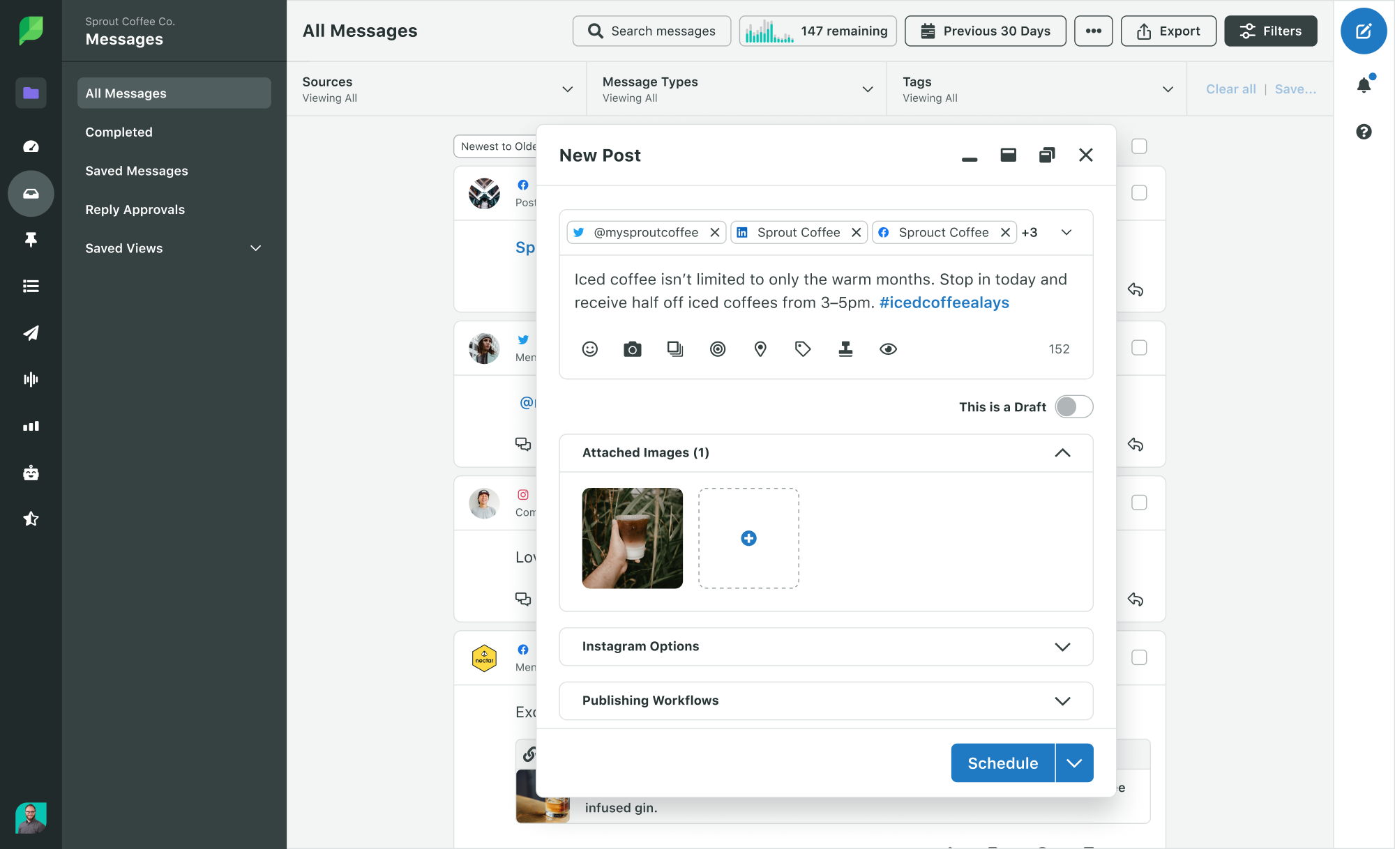 Ter ferramentas de publicação de mídia social como o Sprout Social facilita a publicação de conteúdo aprovado em várias redes de acordo com prazos rigorosos. A janela “Escrever” permite que os usuários agendem e distribuam mensagens com eficiência em uma rede de mídia social, tudo a partir de uma única plataforma. Existe até uma solução de aprovação de mensagens integrada para que as pessoas possam ser marcadas para revisar e aprovar cada postagem antes que ela seja publicada.