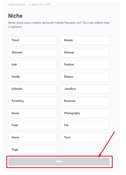 Passo – 6: Escolha o seu nicho e clique em 'Next'.