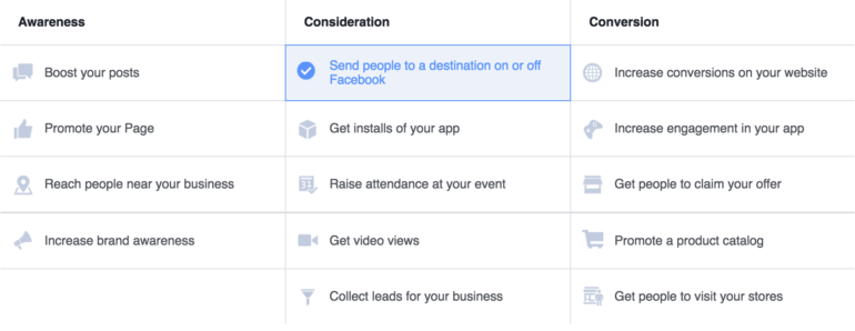 Em 2017, crie o alinhamento dos objetivos da campanha com o resultado comercial desejado. Existem várias opções para escolher, portanto, certifique-se de selecionar a correta e testar as outras.