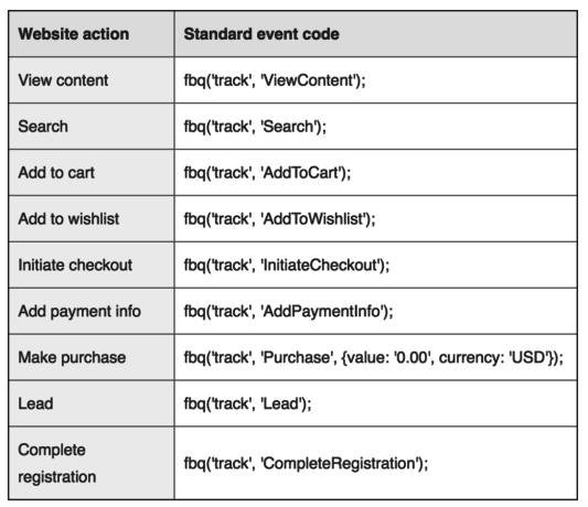 Você deseja ter certeza de que o Pixel do Facebook está devidamente colocado em seu site e, em seguida, dar o próximo passo criando eventos. Existem dez eventos padrão que você usa para otimizar e rastrear suas campanhas.