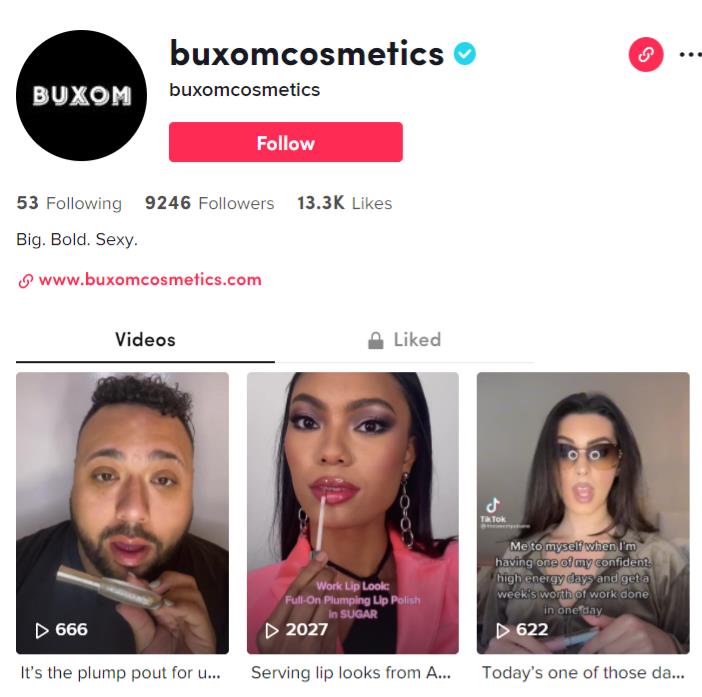 A BUXOM Cosmetics usa apenas três palavras em sua biografia do TikTok que corresponde ao que eles representam, ou seja, grande, ousado e sexy. Isso é curto e conciso, ao mesmo tempo em que se alinha perfeitamente com a personalidade da marca.