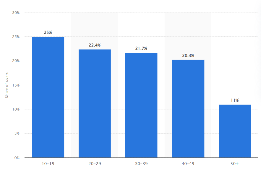 Segundo números da Statista , 25% dos usuários do TikTok têm entre 10 e 19 anos. Enquanto isso, as pessoas na faixa etária de 20 a 29 anos representam 22,4% da base de usuários da plataforma. E as pessoas de 30 a 39 anos representam 21,7% do público total do TikTok.