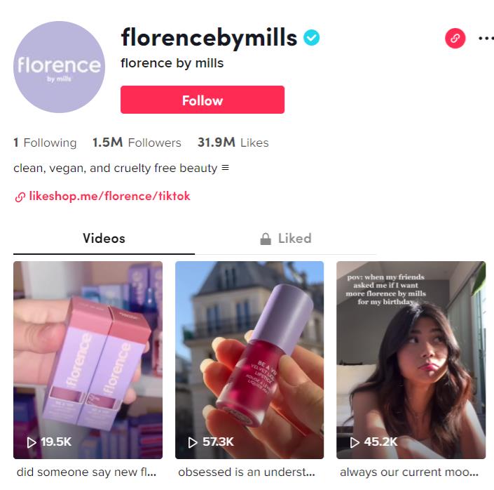 Por exemplo, florence by mills inclui um link para sua página LikeShop para que os espectadores possam encontrar (e comprar) rapidamente os produtos do feed do TikTok. O URL mostra claramente o nome da marca para que pareça limpo e confiável. Da mesma forma, você pode usar outras ferramentas de link em bio como InstaBio, Linktree e LinkFolio para guiar facilmente as pessoas ao seu conteúdo ou produtos.