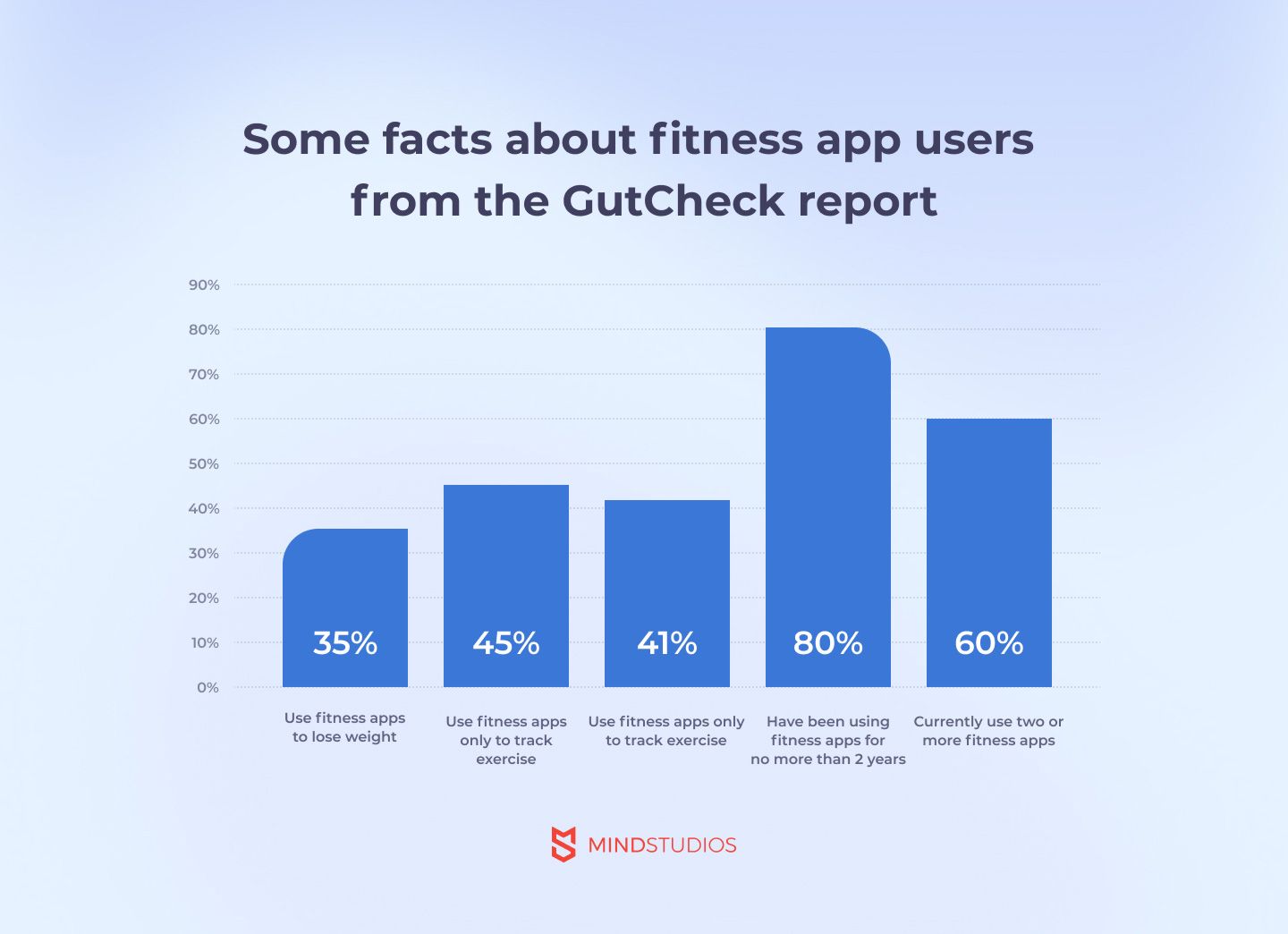 Que tal definir usuários-alvo para um aplicativo de condicionamento físico? Os usuários dos EUA têm a maior taxa de adoção de aplicativos de fitness em todo o mundo. Com base na pesquisa anual de Saúde e Saúde da Gallup, a porcentagem de americanos que usam aplicativos de condicionamento físico é a seguinte: