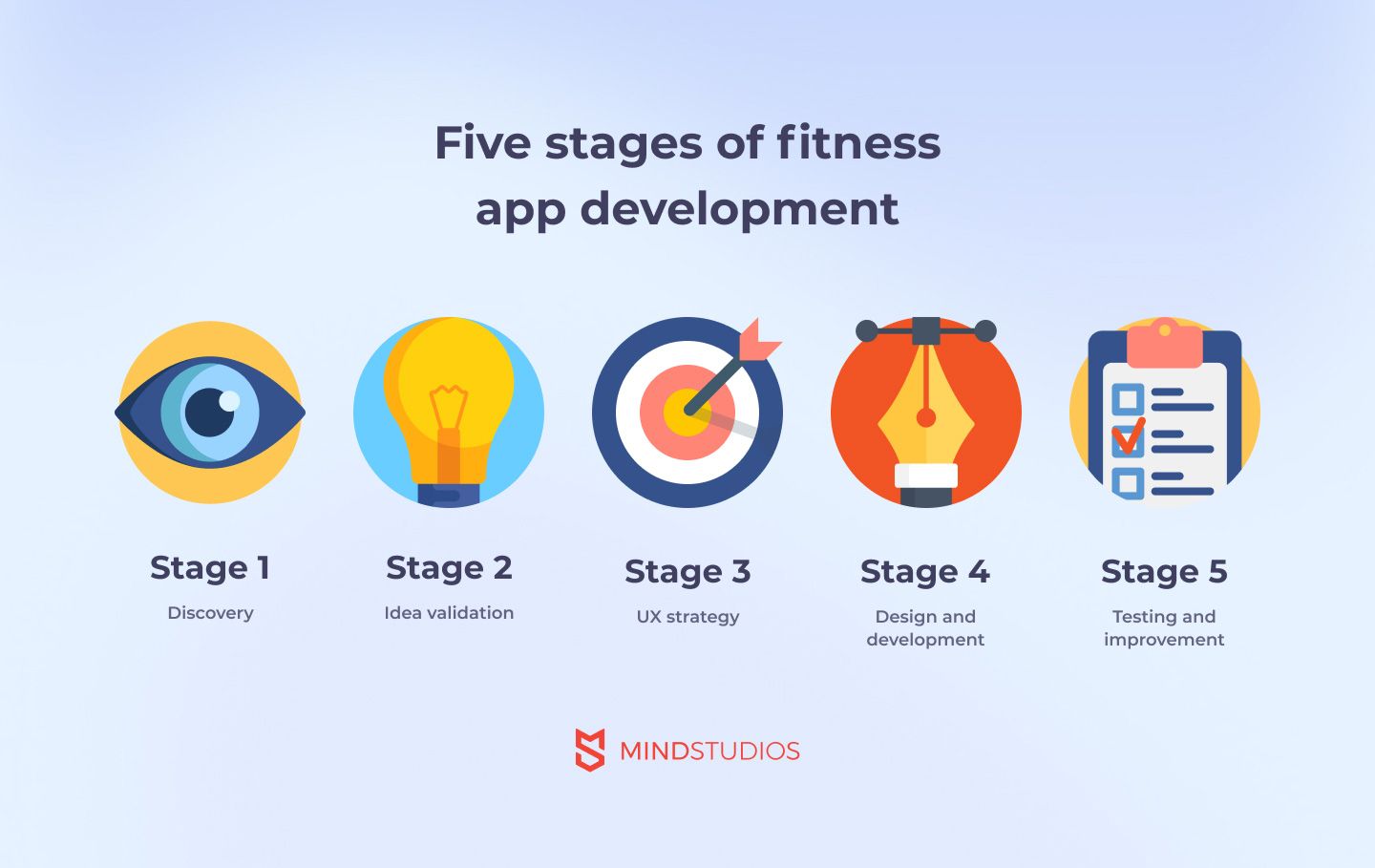 Etapa 1 - descoberta. Nesse estágio, sua equipe de desenvolvimento de aplicativos móveis conduz uma pesquisa de mercado inicial e descobre se sua ideia de aplicativo de condicionamento físico é comercializável ou o que pode torná-la comercializável. Com um gerente de produto, designer e gerente de projeto, você terá ideias e: