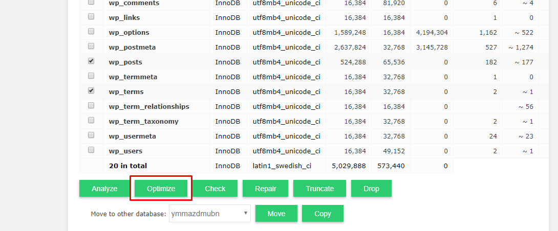 - Otimização de banco de dados WordPress usando phpMyAdmin