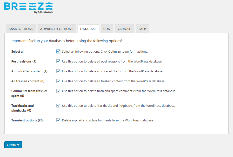 Assim que o plugin for instalado e ativado, vá para Breeze → Configurações → Banco de dados e selecione Selecionar tudo ou escolha a opção desejada para otimização.