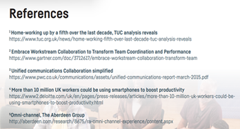 Considere este white paper, Unlock the Agile Workspace from Six Degrees, que destaca as principais estatísticas e alavanca fontes e analistas do setor, como TUC, Gartner, PWC e Deloitte. Esta imagem detalha as referências usadas no white paper com títulos e links.