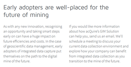 Por exemplo, o white paper da Acquire How Geoscience Data Can Shape the Future of Mining (gated) apresenta uma conclusão que coloca sua solução no centro do sucesso do leitor. Ele explica como os early adopters estão bem posicionados para o futuro da mineração e conclui convidando o leitor a enviar um e-mail para obter mais informações e agendar uma reunião para discutir seu ambiente de coleta de dados e como eles podem se beneficiar dessa solução.