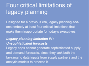 O tipo de solução de problema permite que você analise as desvantagens, limitações, consequências não intencionais e compensações das soluções tradicionais. Por exemplo, considere este white paper da Kinaxis, Como os CIOs podem melhorar o gerenciamento da cadeia de suprimentos. Ele detalha quatro limitações do planejamento legado, como previsões não sofisticadas.