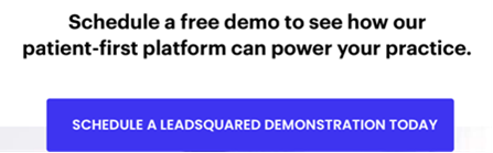 Ele identifica uma ação (agende uma demonstração gratuita), uma solução (plataforma com foco no paciente) e o produto ou empresa (LeadSquared). A divulgação da demonstração é gratuita e reduz o atrito.