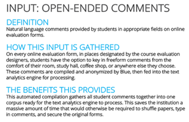 Este exemplo da Explorance, analisando comentários de alunos em avaliações de cursos online com análise de texto azul, detalha o problema e as vantagens técnicas de uma solução de produção específica para ajudar o leitor. Neste trecho, a empresa aborda o desafio de inserir comentários abertos, definindo-os, explicando como eles são coletados e detalhando os benefícios que ele oferece.