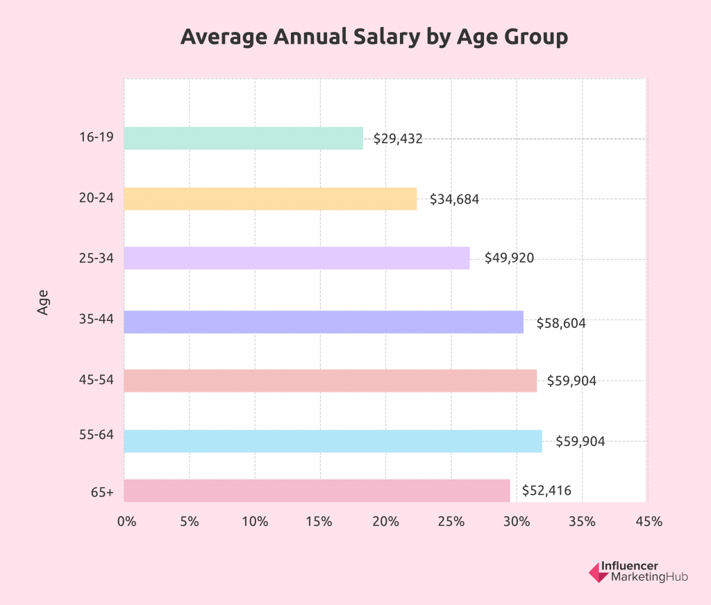 Os anunciantes gostam de segmentar pessoas com dinheiro. E acontece que os grupos mais velhos ganham mais e gastam mais do que os mais jovens. Com base em um relatório da SmartAsset , o salário médio anual por faixa etária é:
