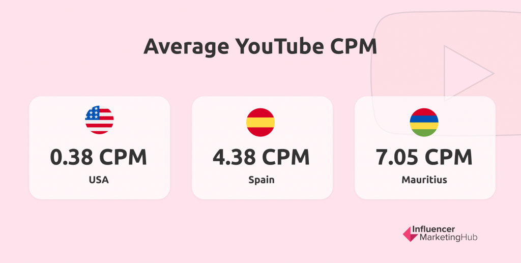 De acordo com um post do Hubspot , 0,38 CPM é a média para os EUA, enquanto 4,38 CPM é a média na Espanha. O país com a média mais alta na época era Maurício em 7,05 CPM.