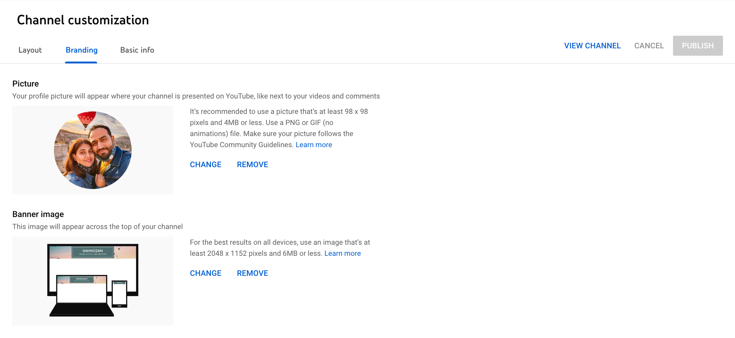 A guia Personalização permite que você personalize a aparência do seu canal para que ele fique atualizado e com a marca. Aqui estão alguns itens que você pode ajustar: