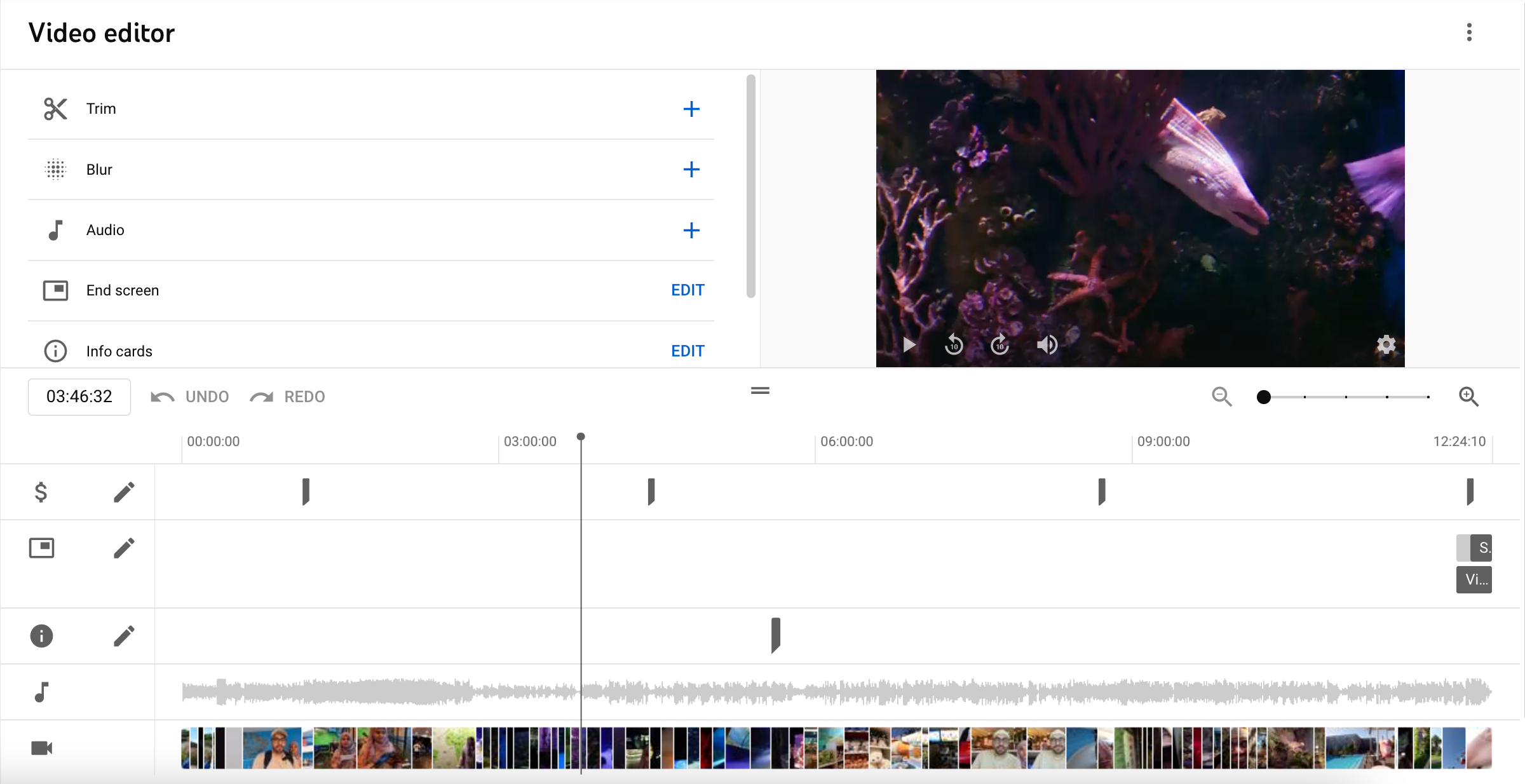 - Áudio: adicione música da biblioteca de áudio do YouTube ao vídeo inteiro ou a determinadas partes. Você pode misturar o áudio adicionado com o som original do vídeo.