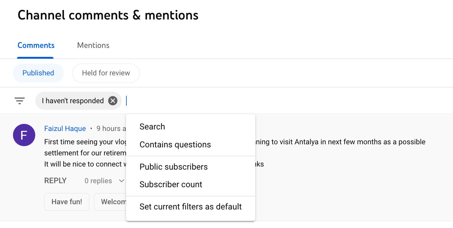 Você pode pesquisar comentários aplicando filtros como status de resposta, se os comentários contêm perguntas, contagem de inscritos e muito mais.