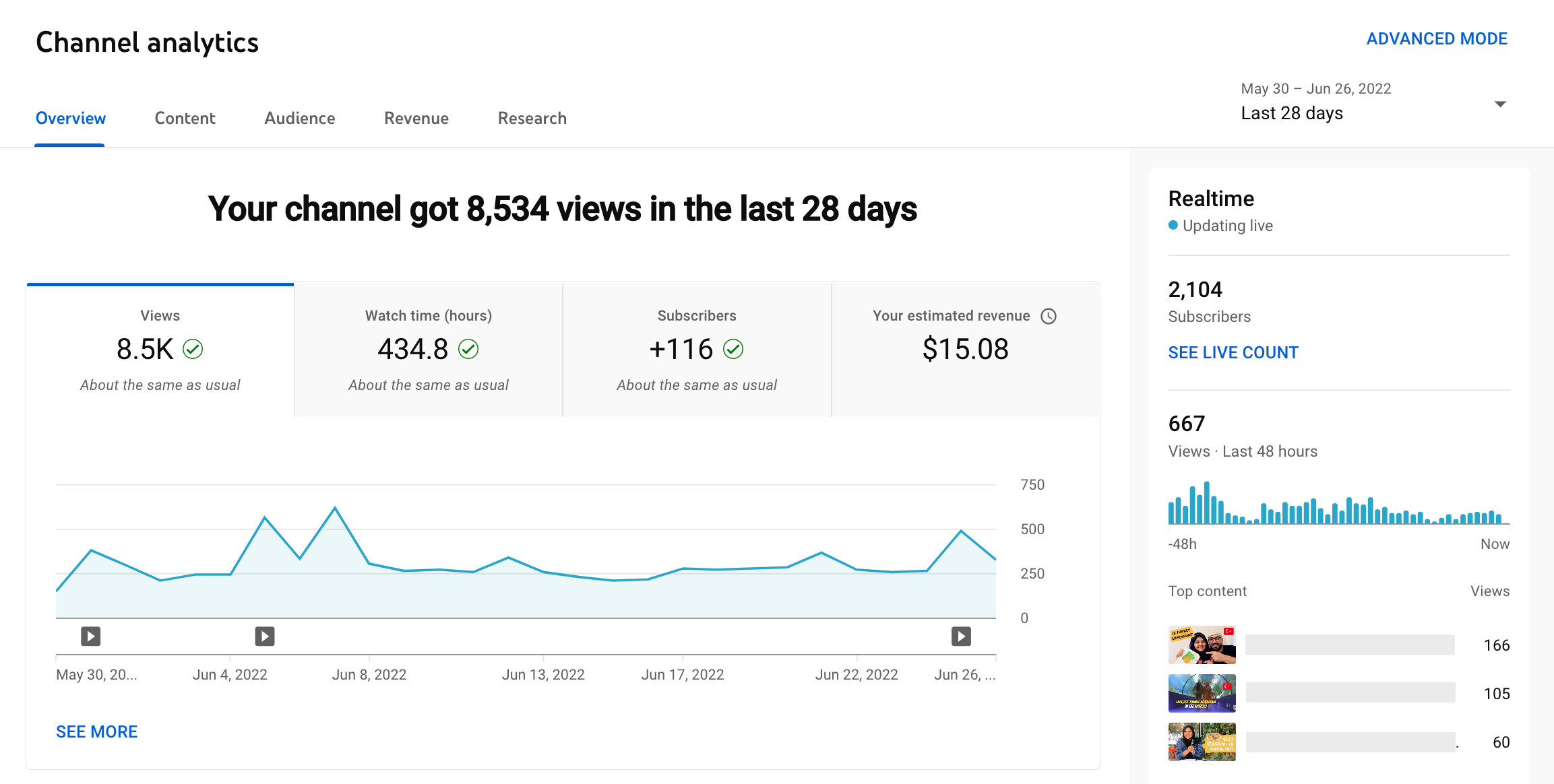 A próxima guia da lista é Analytics . Aqui, você pode ver dados e gráficos detalhados relacionados ao seu canal, conteúdo, público e receita.