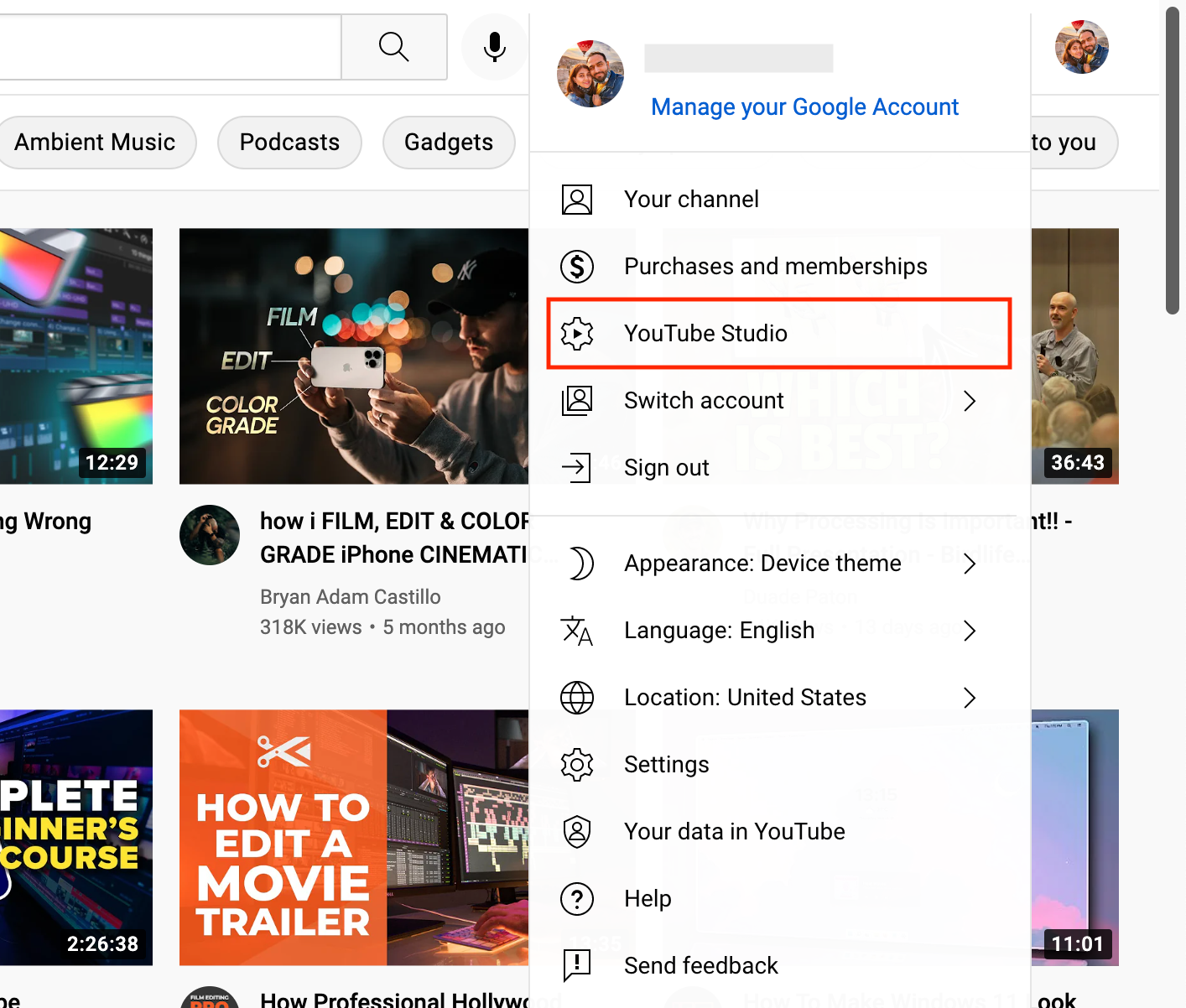 Para acessar o Studio em seu computador, abra o YouTube em seu navegador e faça login. Em seguida, clique no ícone do seu perfil no canto superior direito da tela e selecione YouTube Studio no menu suspenso.