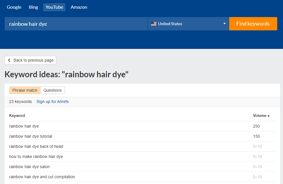 Preso em um título ou palavra-chave para apresentar em seu vídeo mais recente? A ferramenta de palavras-chave gratuita da Ahrefs é um ponto de partida sólido para realizar pesquisas e explorar frases para incluir em seu conteúdo . Isso inclui seus títulos, descrições e tags.