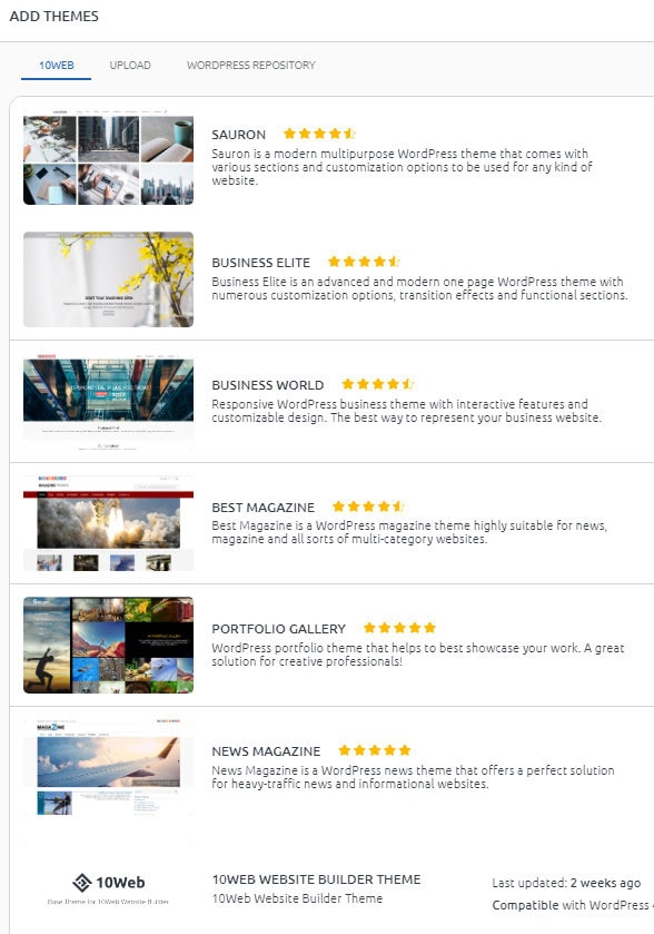- Teme - 10Web oferă în prezent utilizatorilor șase teme care răspund unei varietăți de nevoi și gusturi estetice. Tot ce trebuie să faceți este să instalați și să vedeți ce funcționează pentru dvs.