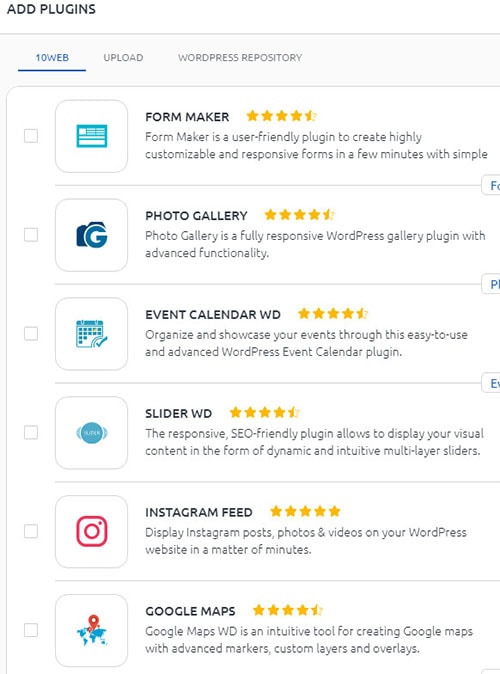 Când utilizați 10Web, puteți conta pe funcționalități de neegalat, deoarece acest serviciu include peste 50 de pluginuri premium pe care le puteți implementa pe site-ul dvs. WordPress. Voi menționa doar câteva plugin-uri, astfel încât să obțineți o imagine de ansamblu a ceea ce obțineți.
