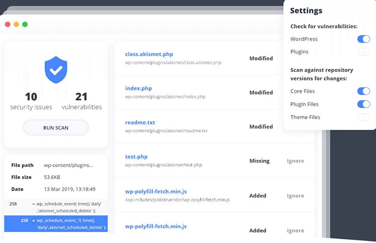 - Scanarea modificărilor de fișiere - motorul de securitate 10Web poate compara toate fișierele dvs. cu copia originală a bazei de date WordPress și vă oferă o listă completă a fișierelor lipsă sau editate.