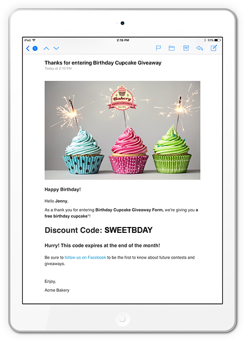 Toți cei care au intrat primesc un răsfăț de ziua de naștere. Tot ce trebuie să știți este numele lor, adresa de e-mail și ziua de naștere. Autoresponderul dvs. este pur și simplu un cadou de ziua de naștere sub forma unui mic tort. Dulce.